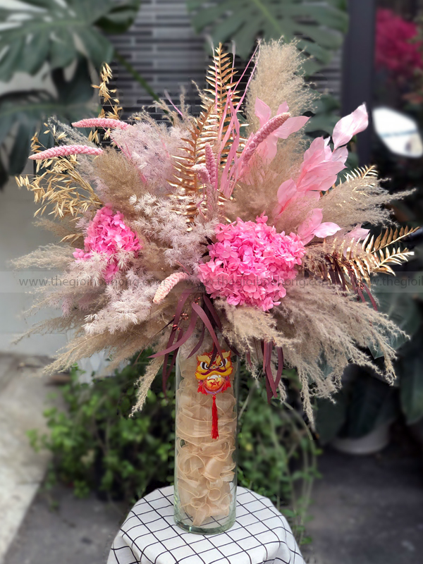 Bình hoa nổi bật với hoa cẩm tú cầu hồng, hoa cỏ lau, yến mạch, hoa kê cùng các loại lá trang trí ánh kim, được cắm thủ công trong bình thủy tinh cao, tạo bố cục bồng bềnh, mềm mại nhưng vẫn sang trọng và ấn tượng.