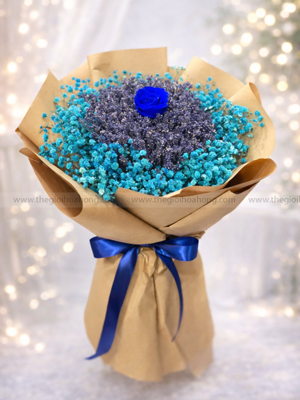 Blue Love là bó hoa khô mang vẻ đẹp thanh lịch và chiều sâu cảm xúc, nổi bật với 1 hoa hồng xanh vĩnh cửu – biểu tượng của sự tin tưởng, chung thủy và tình yêu bền vững. Hoa được kết hợp hài hòa cùng lavender khô, baby trắng và được bó bằng giấy báo chữ Love mang phong cách cổ điển, tạo nên tổng thể vừa lãng mạn vừa tinh tế.