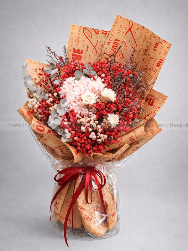 Bó Hoa Khô Eternal Love là sự kết hợp hài hòa giữa sắc đỏ nồng nàn và trắng thanh khiết, mang đến tổng thể sang trọng, nổi bật và đầy cảm xúc. Thiết kế bó tròn đầy, phối baby đỏ chủ đạo cùng cẩm tú cầu trắng, hoa khô trắng điểm xuyết và lá eucalyptus bạc tạo chiều sâu tinh tế.