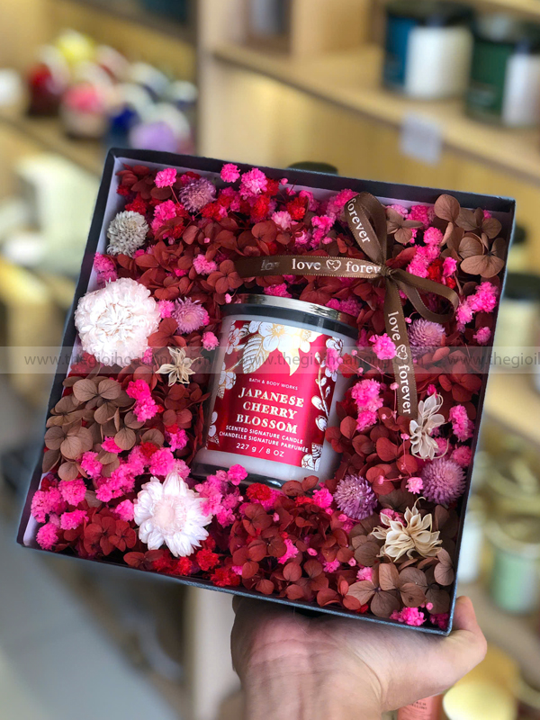 Hoa anh đào tượng trưng cho sự khởi đầu mới, may mắn và tình yêu tinh khôi. Kết hợp cùng nến thơm và hoa khô, hộp quà mang thông điệp yêu thương bền lâu, là lựa chọn hoàn hảo cho sinh nhật, kỷ niệm, tân gia hoặc làm quà tặng tinh tế cho người phụ nữ bạn trân quý.
