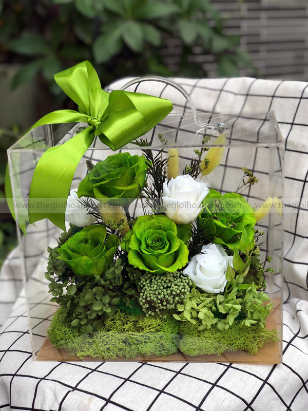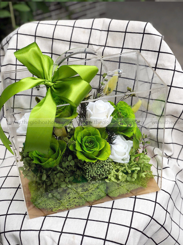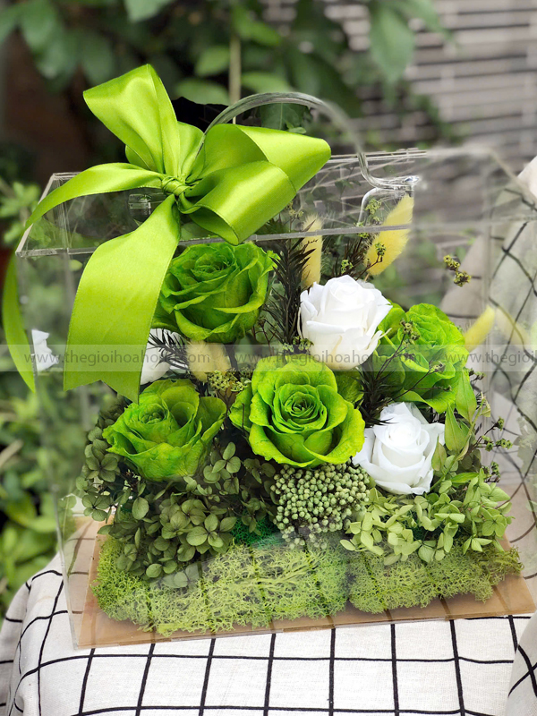 - 4 bông hoa hồng vĩnh cửu xanh lá – tượng trưng cho sự may mắn, sức sống và hy vọng.