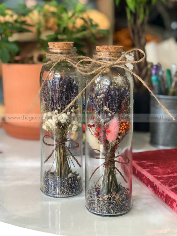 - Chất liệu: Hoa Lavender khô tự nhiên, lọ thủy tinh, dây thừng trang trí